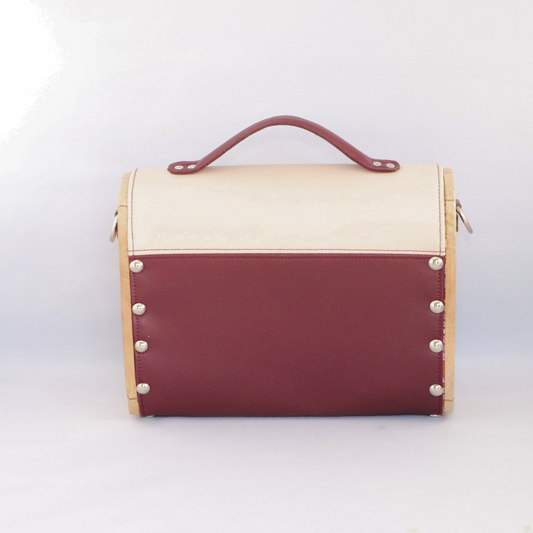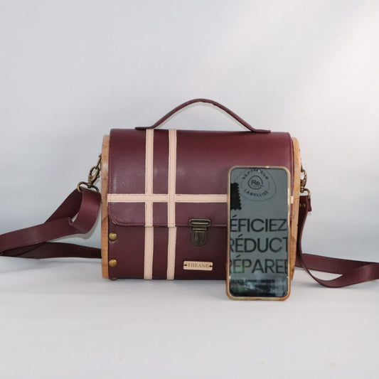 Petit sac cartable bois et alter-cuir de raisin sable et bordeaux 85